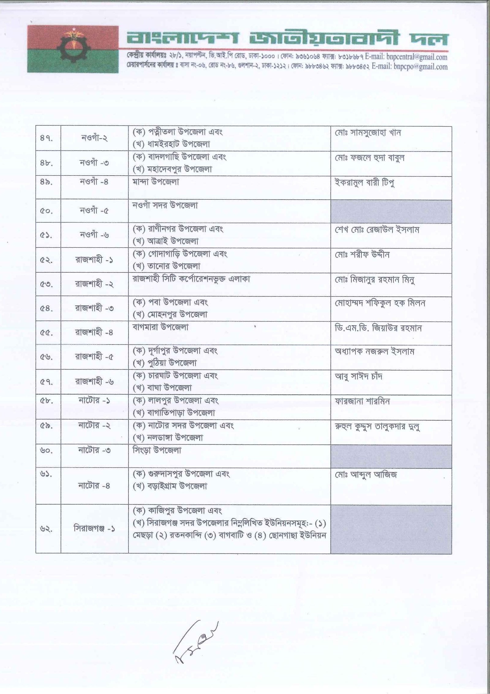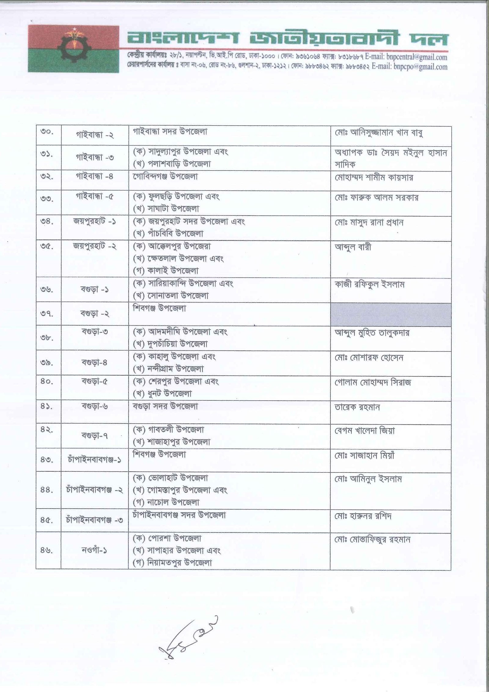 বগুড়া-৬ আসন থেকে বিএনপির ভারপ্রাপ্ত চেয়ারম্যান তারেক রহমান নির্বাচন করবেন। তিনি এই প্রথমবার সংসদ নির্বাচনে অংশ নিতে যাচ্ছেন। এছাড়া বিএনপি মহাসচিব মির্জা ফখরুল ইসলাম আলমগীর ঠাকুরগাঁও-১, স্থায়ী কমিটির সদস্য হাফিজ উদ্দিন আহমেদ ভোলা-৩, গয়েশ্বর চন্দ্র রায় ঢাকা-৩, মির্জা আব্বাস ঢাকা-১০ আসনে নির্বাচনে লড়বেন।